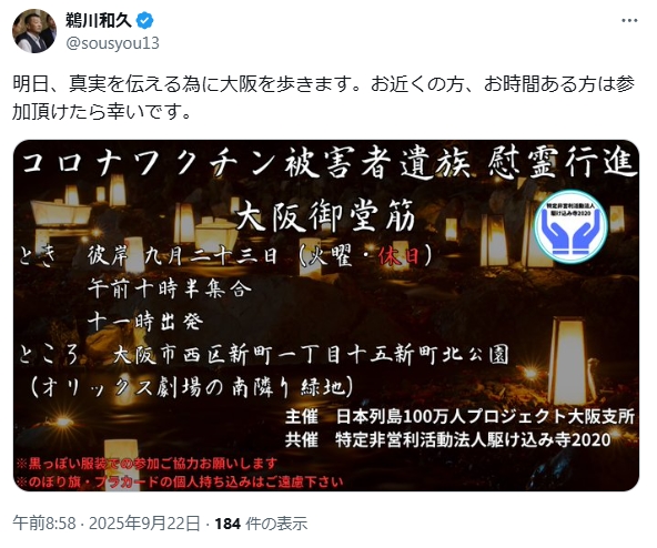 - 2025年9月23日(火・祝)コロナワクチン被害者遺族 慰霊行進大阪御堂筋