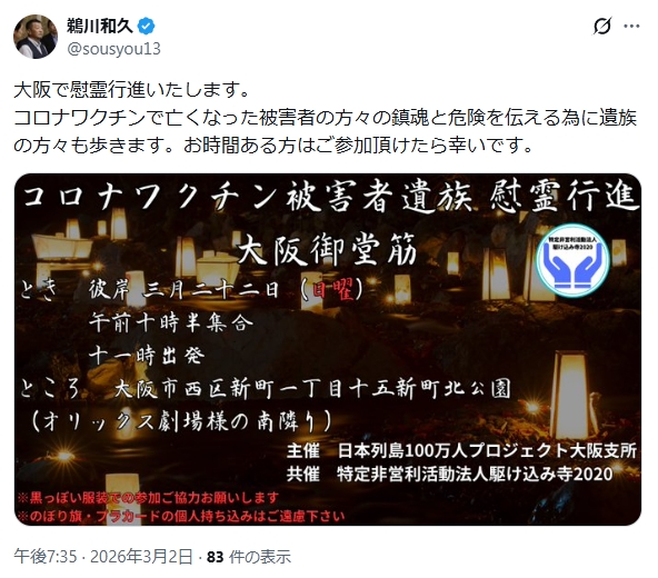 - 2026年3月22日(日)コロナワクチン被害者遺族慰霊行進 大阪御堂筋